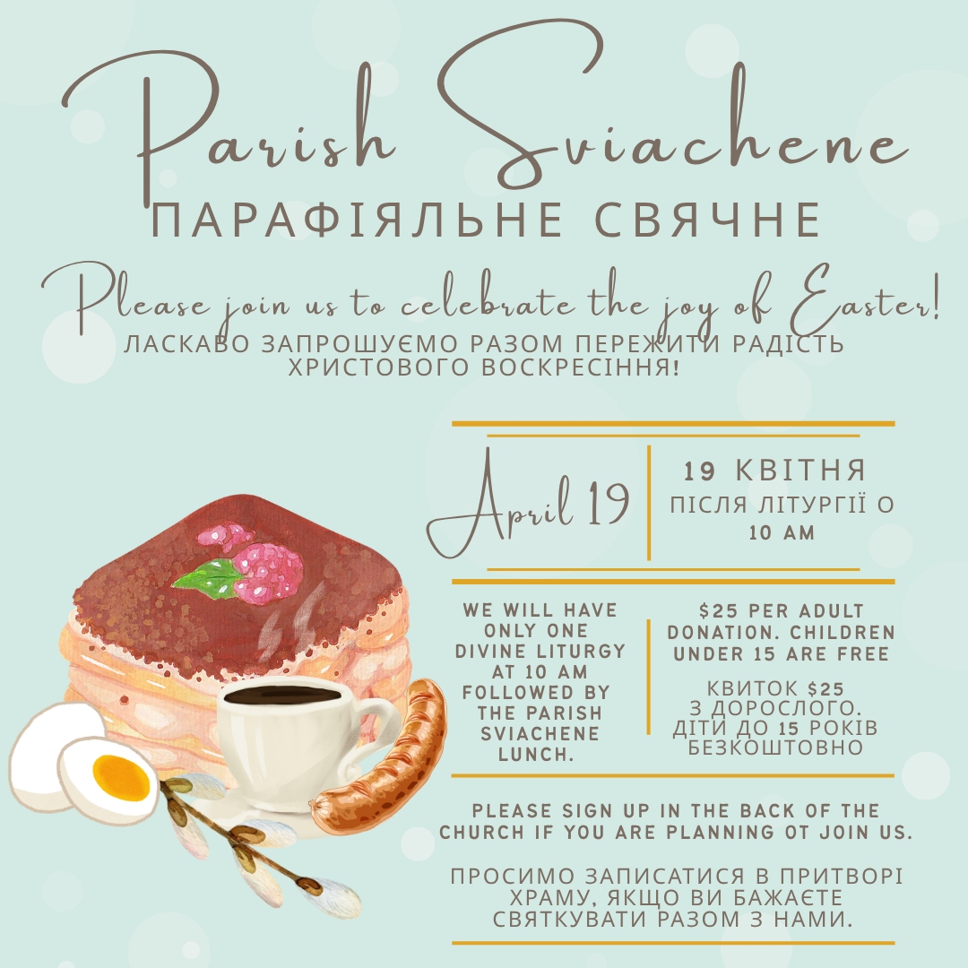 19 квітня -Парафіяльне свячене – щиро запрошуємо на парафіяльне свячене, яке відбудеться 19 квітня в неділю після Літургії. В цей день буде тільки одна Літургія о 10 годині. Просимо записатися в притворі храму, якщо ви бажаєте святкувати разом з нами. Кошт для дорослих – $25, для дітей…Read more